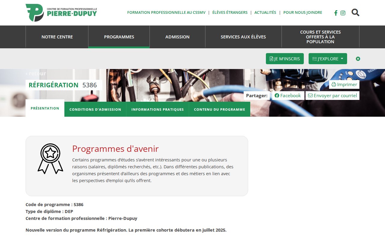 Credential: certificate. Duration: 18 months. Format: in person. Curriculum: Air conditioning installation, Refrigeration systems, System maintenance and repair, Inspection procedures. Accreditation: Commission de la construction du Québec (CCQ). Montreal area CFP. New program version starting July 2025. DEP program