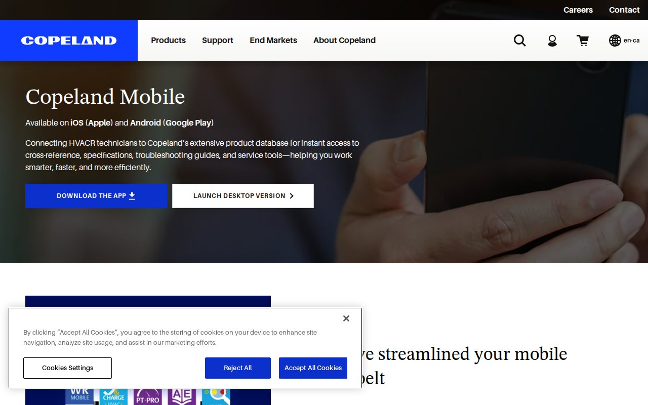 The Copeland Mobile app provides access to Copeland's full OPI compressor database including specs, wiring diagrams, and troubleshooting guides. Technicians can scan barcodes to identify compressors, cross-reference replacements, perform diagnostics, and use jobsite commissioning tools. Widely used on Copeland and Emerson compressors across North America.