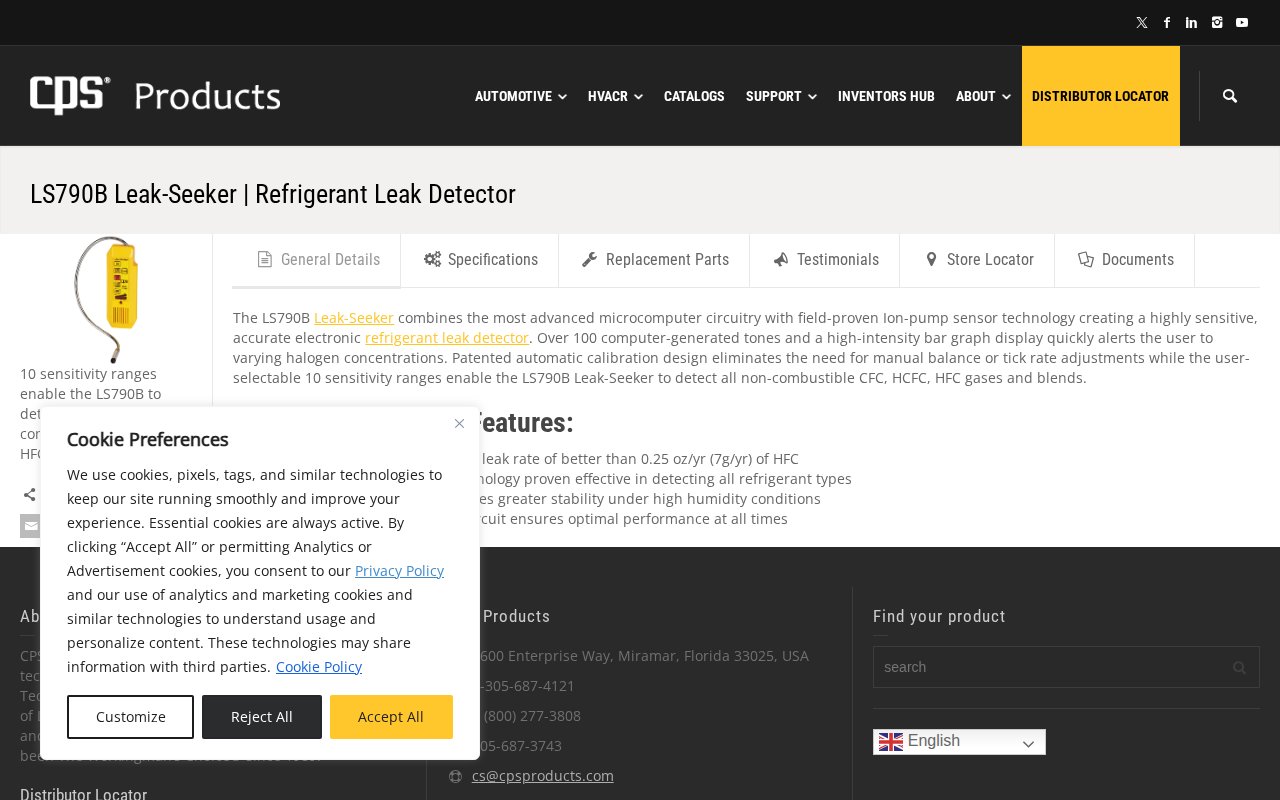 The CPS LS790B Leak-Seeker uses field-proven ion-pump sensor technology with 10 user-selectable sensitivity ranges to detect all non-combustible CFC, HCFC, and HFC gases and blends at leak rates better than 0.25 oz/yr. Features patented automatic calibration, over 100 computer-generated alert tones, high-intensity bar graph display, and a patented water vapor filter for superior stability in high humidity conditions.
