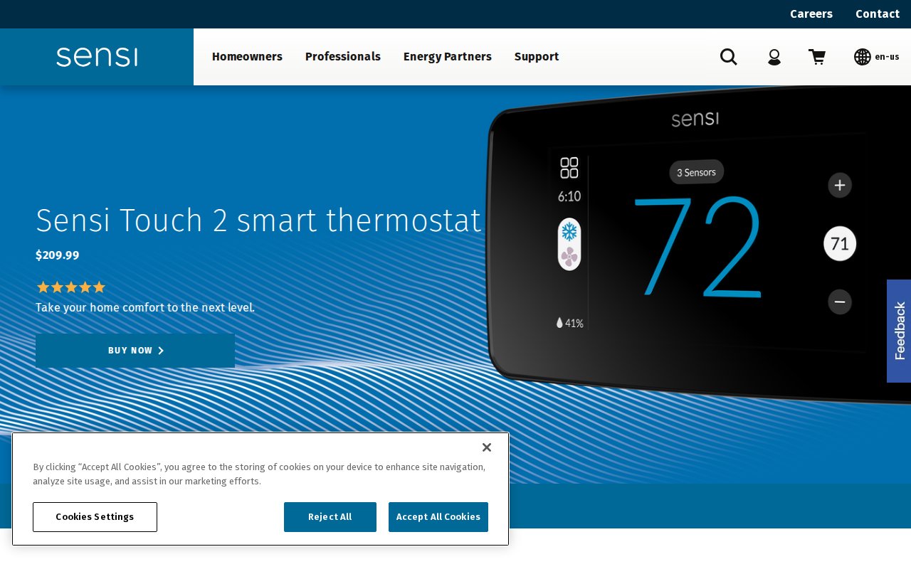 The Emerson Sensi Touch 2 is a contractor-friendly smart thermostat with a modern glass LCD touchscreen and enhanced compatibility with room sensors. It supports single-stage and multi-stage conventional systems (gas, oil, propane, electric) and heat pump systems, saving up to 23% on HVAC energy through flexible scheduling, remote access, and usage reports. Requires a C-wire and integrates with Amazon Alexa and Google Assistant. Backed by a 3-year limited warranty.