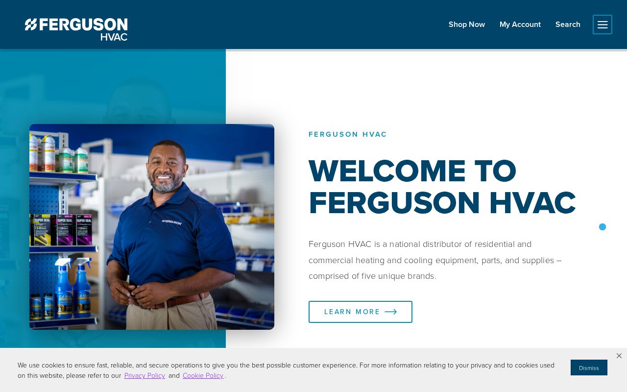 Online ordering portal from Ferguson, the largest US HVAC distributor with 1,700+ locations. Provides 24/7 access to 1M+ SKUs, barcode scanning for reordering, real-time pricing, and HVAC parts search by model or serial number. HVAC PRO Solutions program with seasonal benefits.