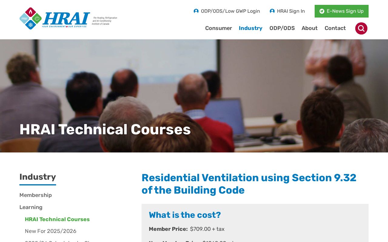 Canadian HVAC training from HRAI on residential ventilation design using CSA F326 Section 9.32. Prerequisite for RASDT designation. Covers duct sizing, HRV/ERV selection, make-up air design, and compliance with National and Provincial Building Codes.