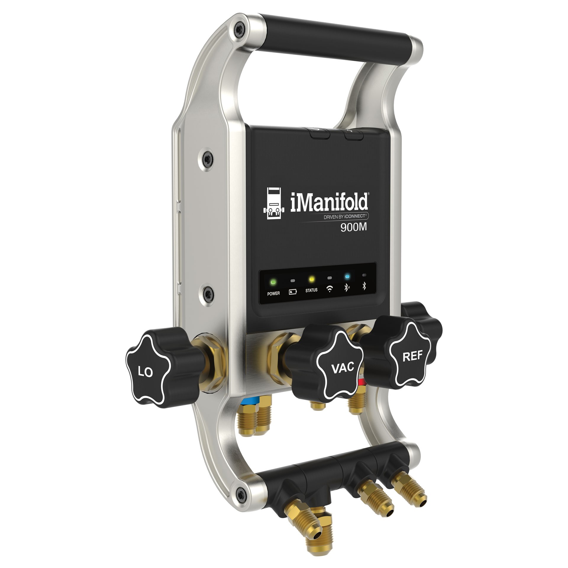 Wireless digital refrigeration manifold with deep system analysis features and guided troubleshooting. The iManifold 900M connects via Bluetooth to the iManifold mobile app for real-time diagnostics. Notable for integrated superheat/subcooling calculations and system performance analysis capabilities for HVAC technicians.
