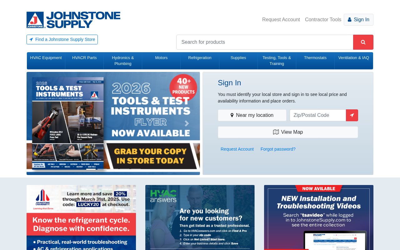 Online ordering platform from Johnstone Supply's cooperative network of 450+ independently owned stores. Features local store identification, account-specific pricing, order history, and dedicated sales team support for HVAC/R contractors.