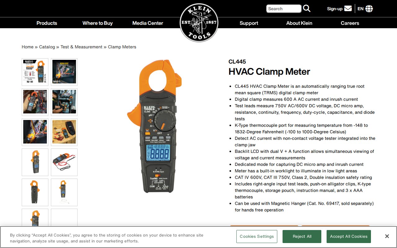 The Klein Tools CL320 HVAC clamp meter provides true RMS AC current measurement to 400A, AC/DC voltage, resistance, capacitance for motor capacitor testing, temperature with K-type thermocouple, and low-impedance mode. Designed for HVAC technicians with auto-ranging, data hold, and backlit display. Part of Klein's HVAC electrical test kit ecosystem.