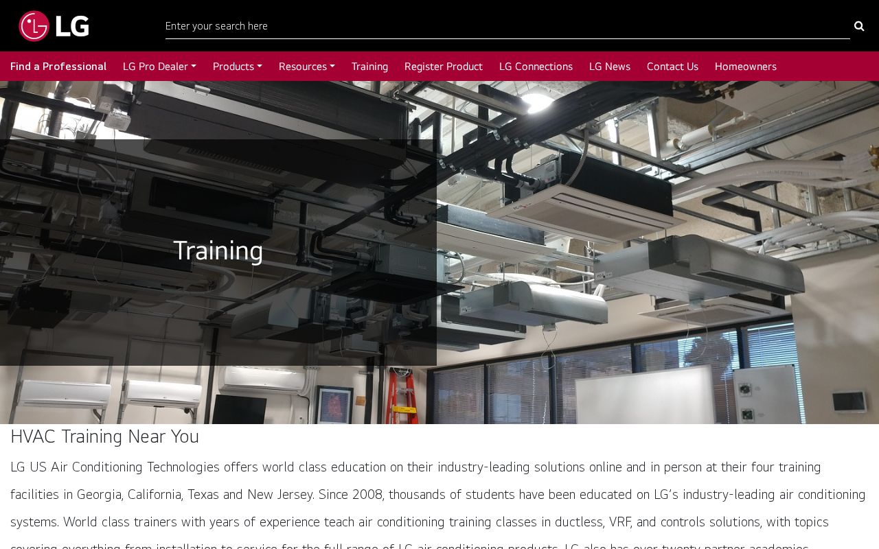 LG's MLV training series progressively covers Multi V VRF from fundamentals (MLV-01) through advanced service and error code diagnostics (MLV-09/10). Required for LG HVAC Pro Elite contractor status. Also offers Art Cool and cassette-specific service training.