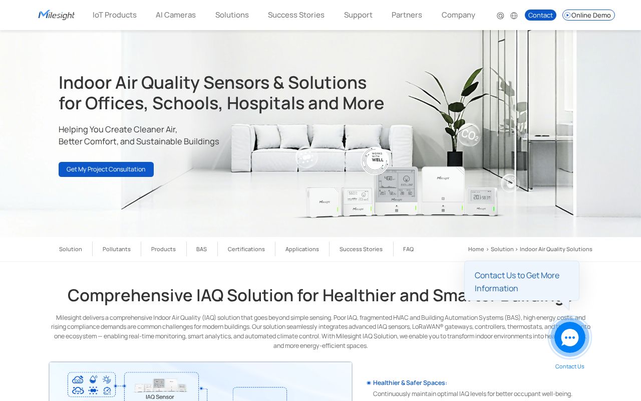Milesight IAQ sensors monitor PM, VOCs, CO2, temperature, and humidity with LoRaWAN wireless communication enabling long-range, low-power deployment. Integrates with most BMS/EMS systems and can be paired with Zoho IoT platform for centralized management. Supports occupancy-based ventilation adjustment and predictive maintenance workflows.