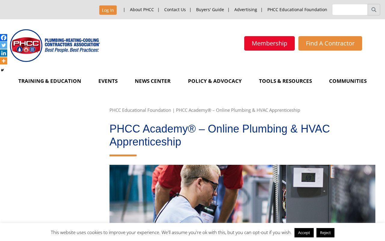 PHCC Academy is ideal for small contractors who cannot send apprentices to classroom instruction. Free Workforce Readiness Course for pre-screening. HVACR Pre-Apprentice $29, and yearly apprentice courses for multi-year progression. LMS-delivered with industry expert content.