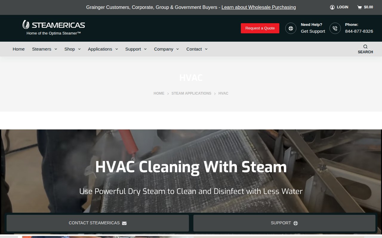Steamericas provides Optima Steamer industrial dry steam cleaning systems for HVAC applications. These chemical-free steam cleaners effectively remove dirt, grease, and biological buildup from condenser and evaporator coils while drastically reducing water usage compared to traditional pressure washing methods.