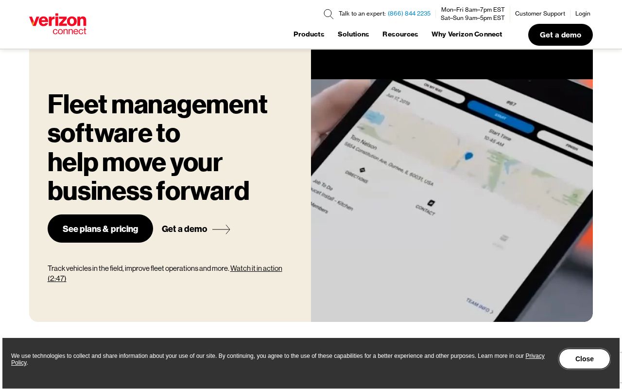 Integrated Verizon cellular backbone with enterprise-grade reporting and mixed-fleet support for heavy equipment and service vehicles.