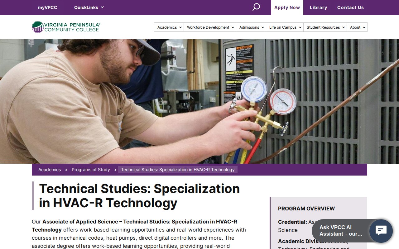 Virginia Peninsula Community College — Technical Studies - Specialization in HVAC-R Technology
