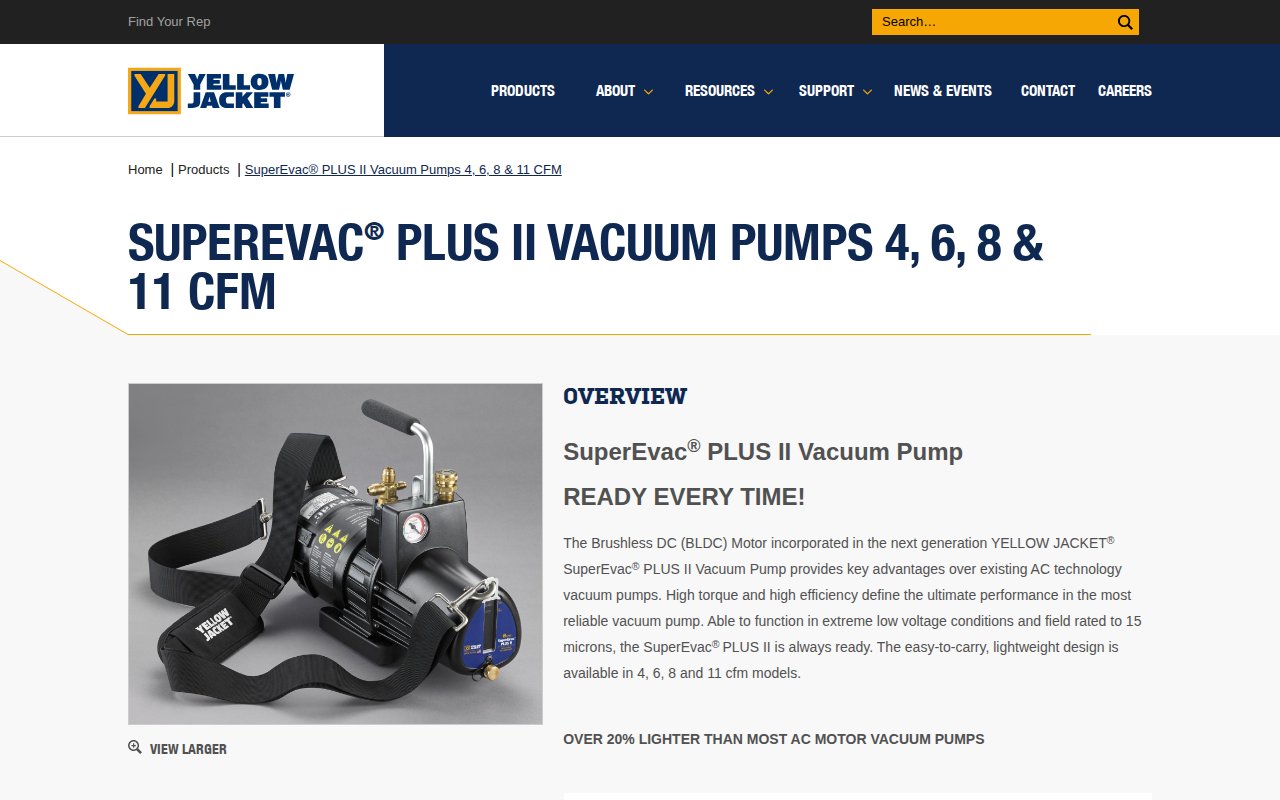 The Yellow Jacket SuperEvac PLUS II series offers 4, 6, 8, and 11 CFM two-stage rotary vane oil-sealed pumps field-rated at 15 microns or better. Features isolation valve for oil changes without losing system vacuum, built-in vacuum indicator gauge, wide-mouth oil reservoir port, gas ballast valve, internal intake check valve, and large oil sight glass. Available in 115V and dual-voltage models. Made in the USA.